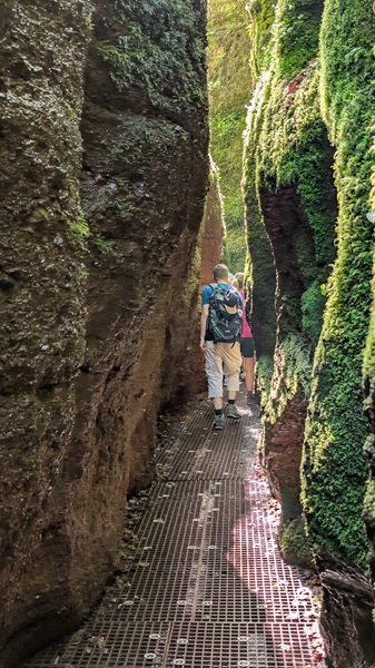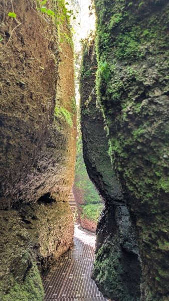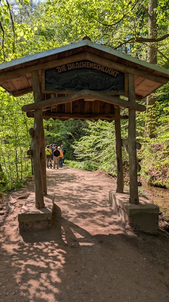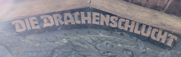 Für heute ist richtig schönes Wetter gemeldet. Genau richtig, um unser Vorhaben, die Drachenschlucht zu durchwandern und anschließend noch bis zur Wartburg zu laufen, umzusetzen. Bis zur Drachenschlucht fahren wir mit dem Bus. Die Haltestelle ist knapp 20 Minuten Fußweg vom Campingplatz entfernt am Wilhelmsthaler See. Von der Haltestelle Drachenschlucht führt ein kurzer Fußweg zum Eingang. Anfangs ist von Schlucht noch nichts zu sehen, eher ein nettes Gebirgstal. Doch einige Wegbiegungen weiter beginnt die eigentliche Schlucht. Enge, steile und von der permanenten Feuchte mit Farn und Moosen bewachsene Felswände säumen den Weg. Wir können nur noch auf Gitterrosten laufen,ssunter denen ein Bach rauscht. Die Schlucht ist so eng, dass man befürchten muss, nur noch quer hindurch zu kommen. Problematisch wird es bei Gegenverkehr. Nach ca. 500 Meter ist die Schlucht zu Ende.