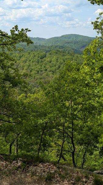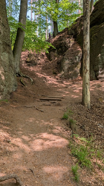 (für unsere Verhältnisse) Anstieg. Dann wird der Weg flacher und ist angenehm zu laufen. Zur Elfengrotte wird