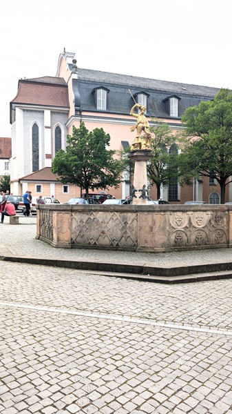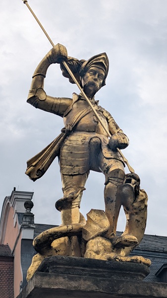 ist. In der Mitte des Marktes ist der Georgbrunnen mit der Georgsfigur.