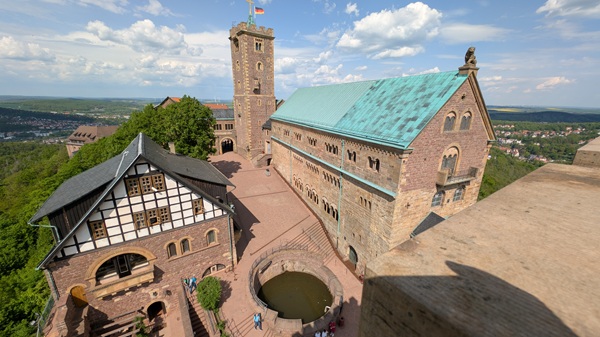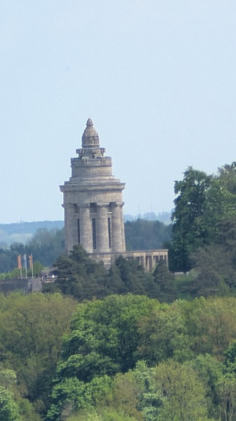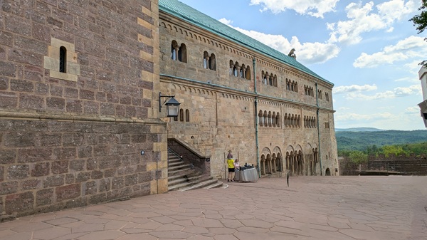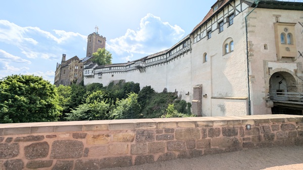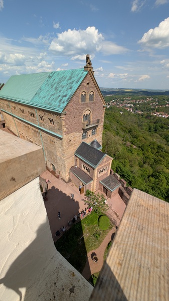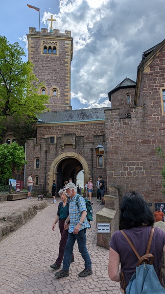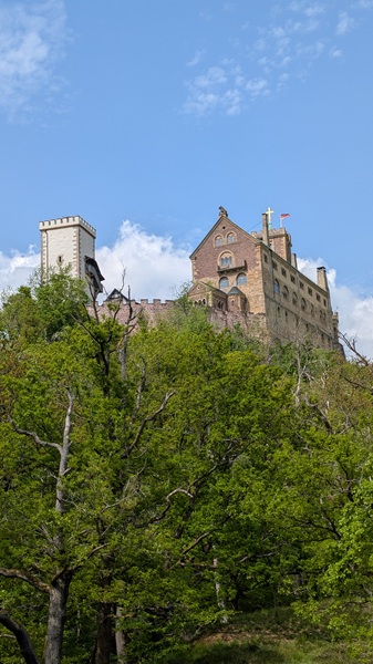 und weiter geht es. An einigen Stellen gibt der Wald den Blick auf den gegenüberliegenden Berg frei. Dann endlich erspähen wir unser Ziel, was aber noch längst nicht erreicht ist. Da müssen noch ein paar Höhenmeter überwunden werden. Rechts von uns sehen wir in der Ferne das Burschenschaftsdenkmal. Der letzte Teil vor Erreichen der Wartburg ist nochmal recht kräftezehrend. Endlich geschafft. Wir schauen uns erst einmal vor der Burg um, bevor es hinein geht. Es ist schon ein gewaltiges Bauwerk.