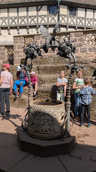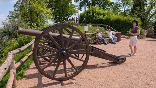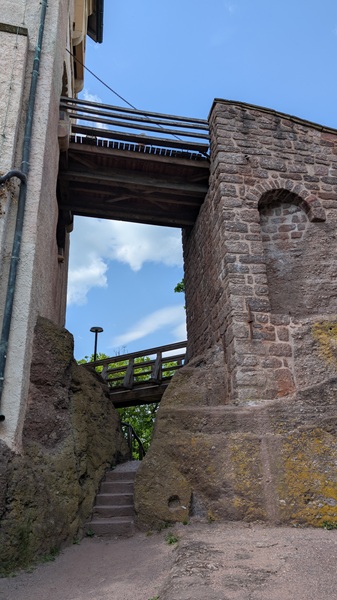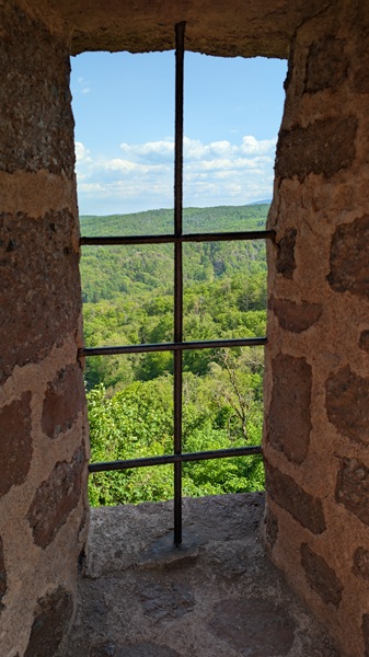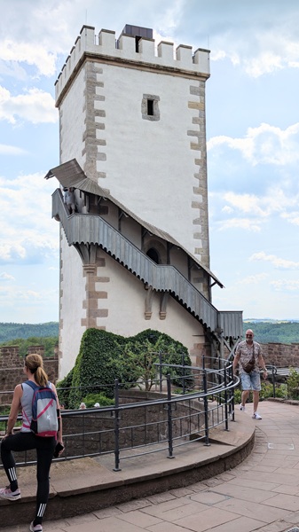 Über die ehemalige Zugbrücke gelangt man in die Vorburg mit dem Ritterhaus (Souveniershop) als Hauptgebäude. Durch die Torhalle mit dem Hauptturm geht es in die Hofburg. Linker Hand befindet sich das Palais als Hauptgebäude. Dem gegenüber ist der ehemalige Marstall, der heute zu einem Restaurant umgebaut wurde. Vor dem Südturm findet man die Zisterne. Für eine Führung durch das Palais blieb leider keine Zeit, aber den Südturm mit seinen 110 Stufen haben wir noch bestiegen und die Aussicht von oben genossen. Egal, in welche Richtung man schaut: Wald, Wald und nochmals Wald.