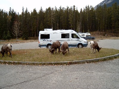 Nach einem kurzen Fußmarsch entlang des Maligne Canyon trafen wir diese Bighorn Sheeps direkt neben unseren Camper bei der Suche nach noch etwas saftigen Gras.