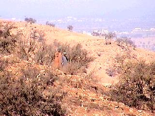 Der dritte Tag führte mich in den Antiatlas. Nachdem die Sousebene hinter mir lag ging es in die Berge. Von Weitem wurde ich von zwei Ziegenhirten beobachtet. Von ihrer Herde war nicht viel zu sehen. Die Ziegen suchen sich das wenige Fressen in den fast vertrockneten Bäumen und Büschen.