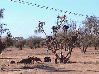 Kein Zirkustrick, die Ziegen klettern freiwillig in die Bäume. Dort finden sie noch was zu fressen. In der Sousebene sieht man immer wieder die kletternden Ziegen. Die Früchte der Arganienbäume sind nicht nur Ziegenfutter, sondern werden zu begehrten Öl verarbeitet.