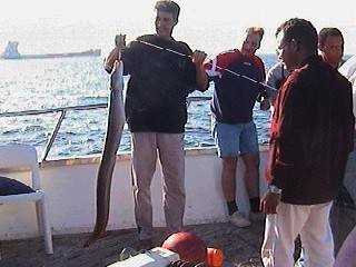 Denkste! Der einzige Fang war dieser Seeaal. Haie und die anderen großen Fischlein haben sich in wärmere Gewässer verzogen. Immer diese Versprechungen von den Reiseveranstaltern!