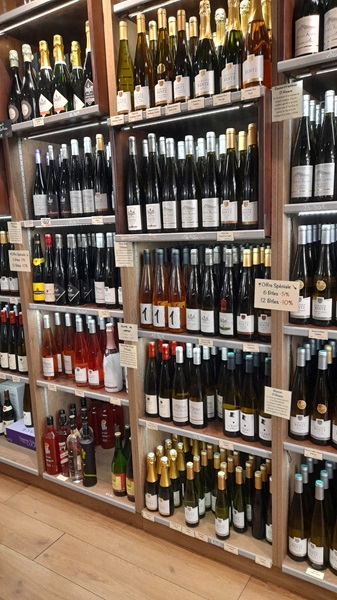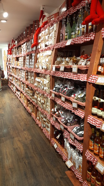 Andenkenkram, Süßwaren und Gebäck, sowie Weinhandlungen.