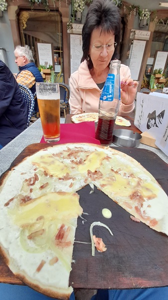 Gastwirtschaft gefunden, die den typischen Flammkuchen anbot. Dünner, knuspriger Teig mit Schmand, Zwiebeln und Munster